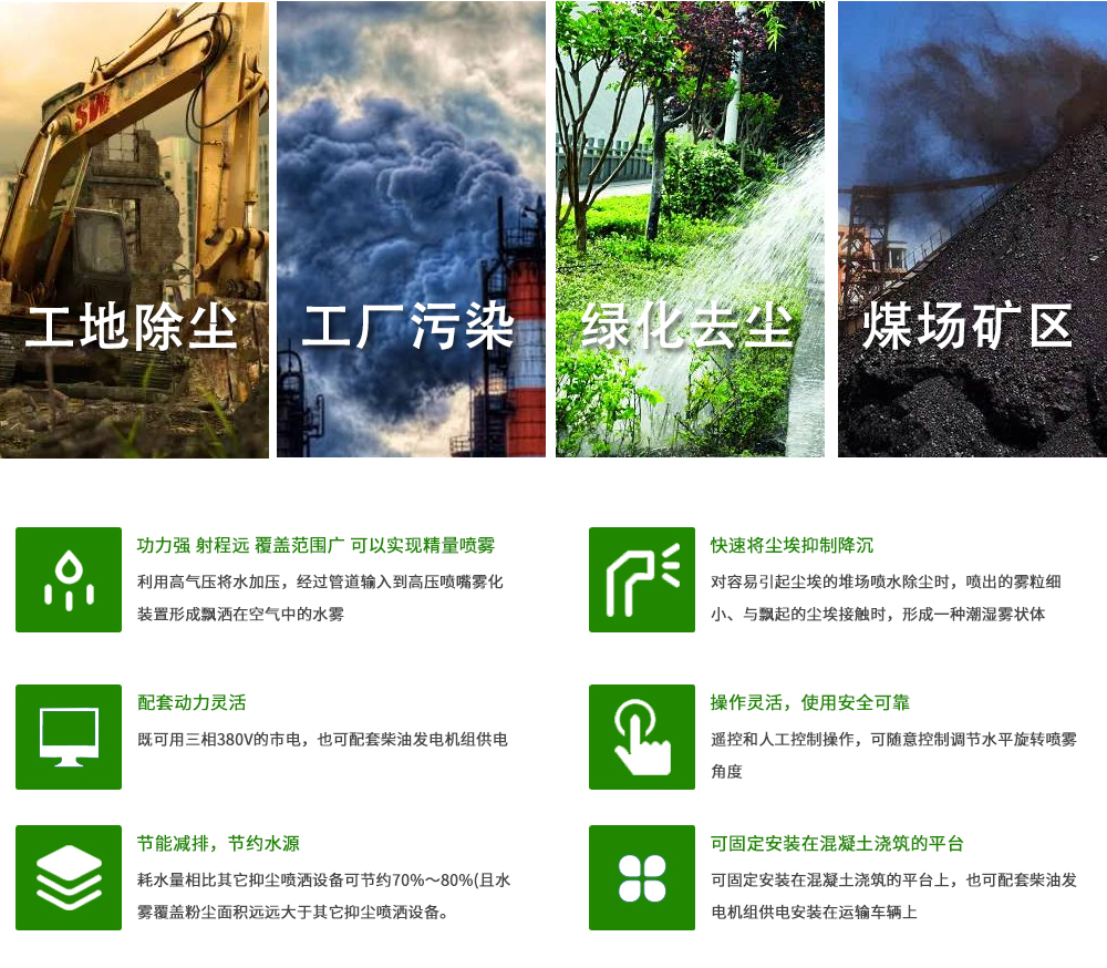 - 功力強、射程遠、覆蓋范圍廣、可以實現(xiàn)精量噴霧;工作效率高、噴霧速度快;</br>- 對容易引起塵埃的堆場噴水除塵時,噴出的霧粒細小、與飄起的塵埃接觸時,形成一種潮濕霧狀體,能快速將塵埃抑制降沉;</br>- 配套動力靈活,既可用三相380V的市電,也可配套柴油發(fā)電機組供電;</br>- 可固定安裝在混凝土澆筑的平臺上,也可配套柴油發(fā)電機組供電安裝在運輸車輛上;</br>- 操作靈活,使用安全可靠,遙控和人工控制操作,可隨意控制調(diào)節(jié)水平旋轉(zhuǎn)噴霧角度;</br>- 耗水量相比其它抑塵噴灑設(shè)備可節(jié)約70%~80%(噴槍、灑水機車),且水霧覆蓋粉塵面積遠遠大于其它抑塵噴灑設(shè)備。